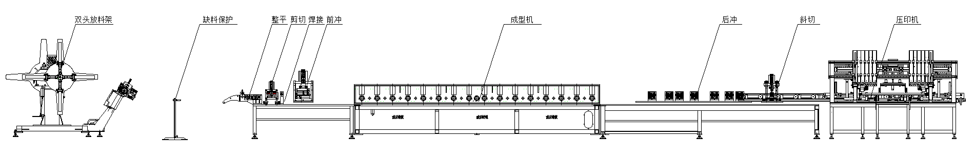 ASTL-15/25光伏鋼邊框生產線由開卷機、校平機、剪切對焊機、伺服送料、滾壓成型、校直跟蹤飛剪、出料架、壓印機、控制系統(tǒng)等組成